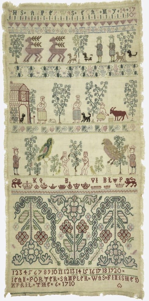 - (At the top): T H I S* SAMPLER * WAS * BEGAN* MAY *14* 17 / 09 (At the bottom): IEAN * PORTER *SAMPLER * WAS * FINISHED / APRIL * THE * 6 * 1710 //