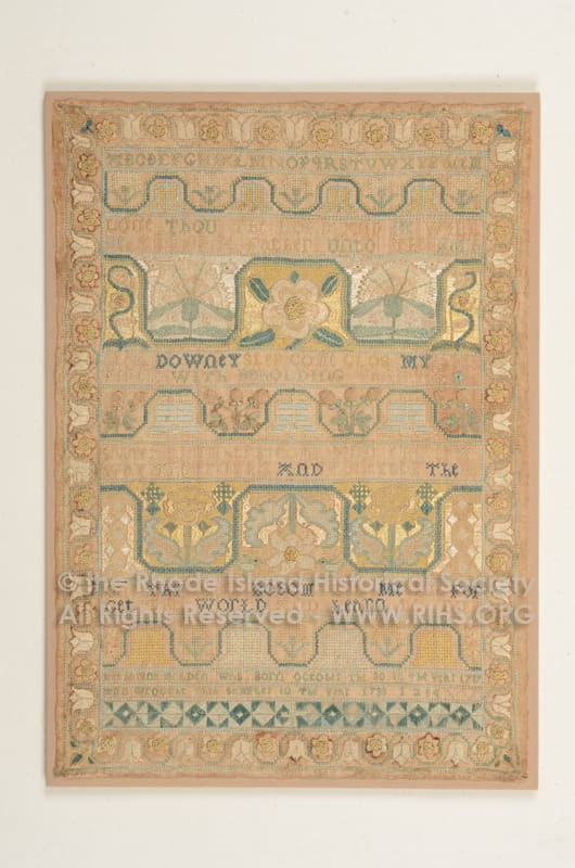 - LOVE THOU ThE LORD AND HE WILL / BE A TENDER FATHER UNTO THE / SLEP DOWNEY SLEP COME CLOSE MY EYES / TIRED WITH BEHOLDING VANITIES / SWEET SLUMBERS COME AND CHASE A / WAY THE TOYLS AND FOLYS OF THE DAY / ON THY SOFT BOSOM LET ME LIE FOR / GET THE WORLD AND LEARN TO DIE. / KATHARINE HOLDEN WAS BORN OCTOBER THE 30 IN THE YEAR 1717 / AND WROUGHT THIS SAMPLER IN THE YEAR 1733