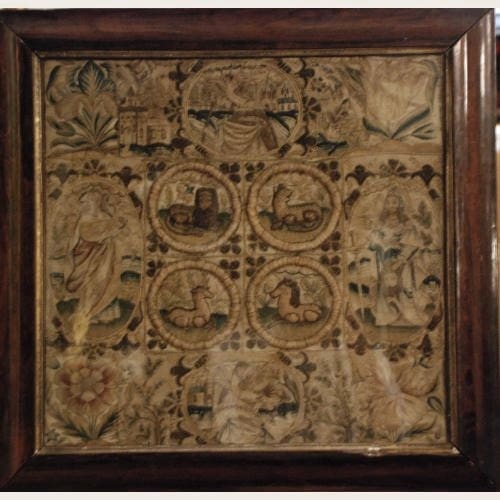 - Mirror with 4 animals set in circular panels in raised work surrounded by emblematic figures and flowers