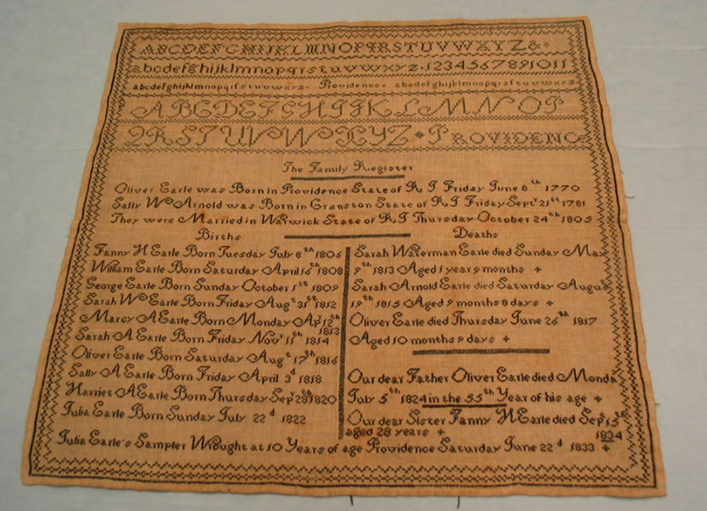 - The Family Register / / (In center): Oliver Earle was Born in Providence State of R I Friday June 6th 1770 / Sally W Arnold was Born in Cranston State of RI Friday Sept 21st 1781 / They were Married in Warwick State of RI Thursday October 24th 1805 / (On L): Births / Fanny H Earle Born Tuesday July 8th 1806 / William Earle Born Saturday April 16th 1808 / George Earle Born Sunday October 1st 1809 / Sarah W Earle Born Friday Aug 31st 1812 / Marcy A Earle Born Monday Apr 12th / Sarah A Earle born Friday Nov 11th 1814 / Oliver Earle Born Saturday Aug 17th 1816 / Sally A Earle Born Friday April 3d 1818 / Harriet A Earle Born Thursday Sept 18th 1820 / Julia Earle Born Sunday July 22d 1822 / / (On Right): Sarah Waterman Earle died Sunday May / 9th 1813 Aged 1 year 9 months + / Sarah Arnold Earle died Saturday August / 19th 1815 Aged 9 months 8 days + / Oliver Earle died Thursday June 26th 1817 / Aged 10 months 9 days+ / Our dear Father Oliver Earle died Monday / July 5th 1824 in the 55th Year of his age + / Our dear Sister Fanny H Earle died Sept 15th / aged 28 years + 1834 / / (Across the bottom): Julia Earle's Sampler Wrought at 10 years of age, Providence Saturday June 22d 1833 + //